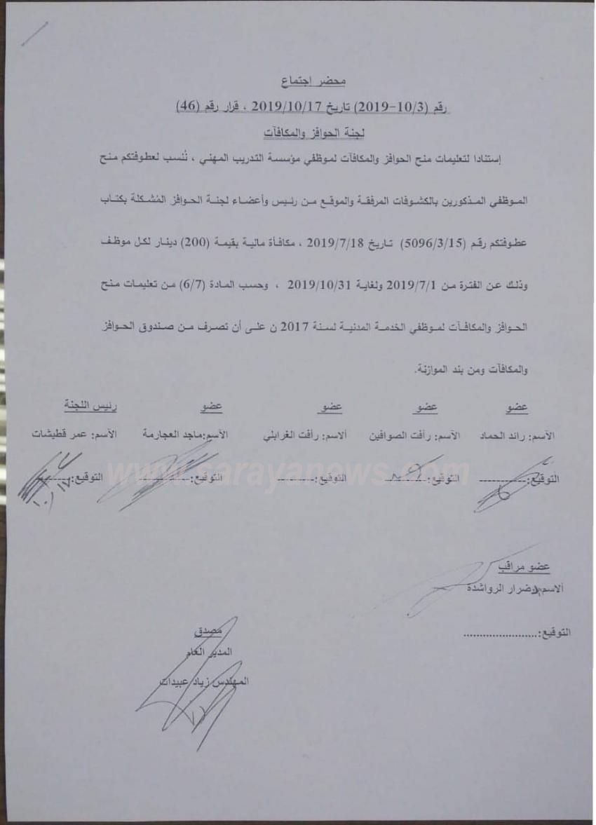 اوراق – قرر مدير عام مؤسسة التدريب المهني المهندس زياد عبيدات صرف مكافأة مالية لموظفين بقيمة 200 دينار لكل منهم من صندوق الحوافز والمكافآت.